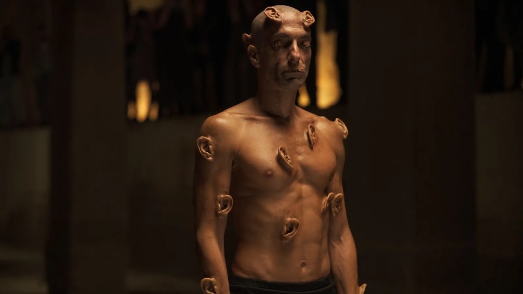 Spettri la cui voce risulta fioca e debole quanto la carne che li ospita. Una carne che richiede di essere lacerata per poter essere compresa, che esige di essere deturpata per potersi riempire nuovamente di fascino e significato. Un corpo indecifrabile, invisibile a se stesso, tanto da venire spesso occultato sotto gli oscuri panni di Seul. Se ne La Promessa dell’Assassino la nudità di Viggo Mortensen era uno dei punti da cui si articolava i il senso dell’opera, in Crimes of the Future è l’esatto contrario. É l’aspetto anti materico del personaggio a muovere dei significati all’interno del film, è il suo corpo etereo a portare avanti delle riflessioni in merito alla sua rappresentazione. Non è un caso infatti che la sua nudità venga mostrata principalmente durante le performance pubbliche dell’uomo e quasi mai altrove. Ed è attraverso questo assetto che David Cronenberg mette in scena l’aspetto trascendentale del corpo umano, il suo aspetto più etereo. Nel film la chirurgica infatti non è altro che un processo che rimodella il corpo più nel fine che nell’estetica, più nel concetto che nell’apparire. L’atto erotico sta nel poter dare un senso alla carne, oltre che uno scopo, riscoprendola sia nella forma che nel contenuto per tornarne padroni per un istante. È in questi frangenti che l’autore va oltre al testo per parlare del suo cinema, o meglio di quella necessità da parte del medium di rimodellare se stesso per indagare i nuovi organi del presente.